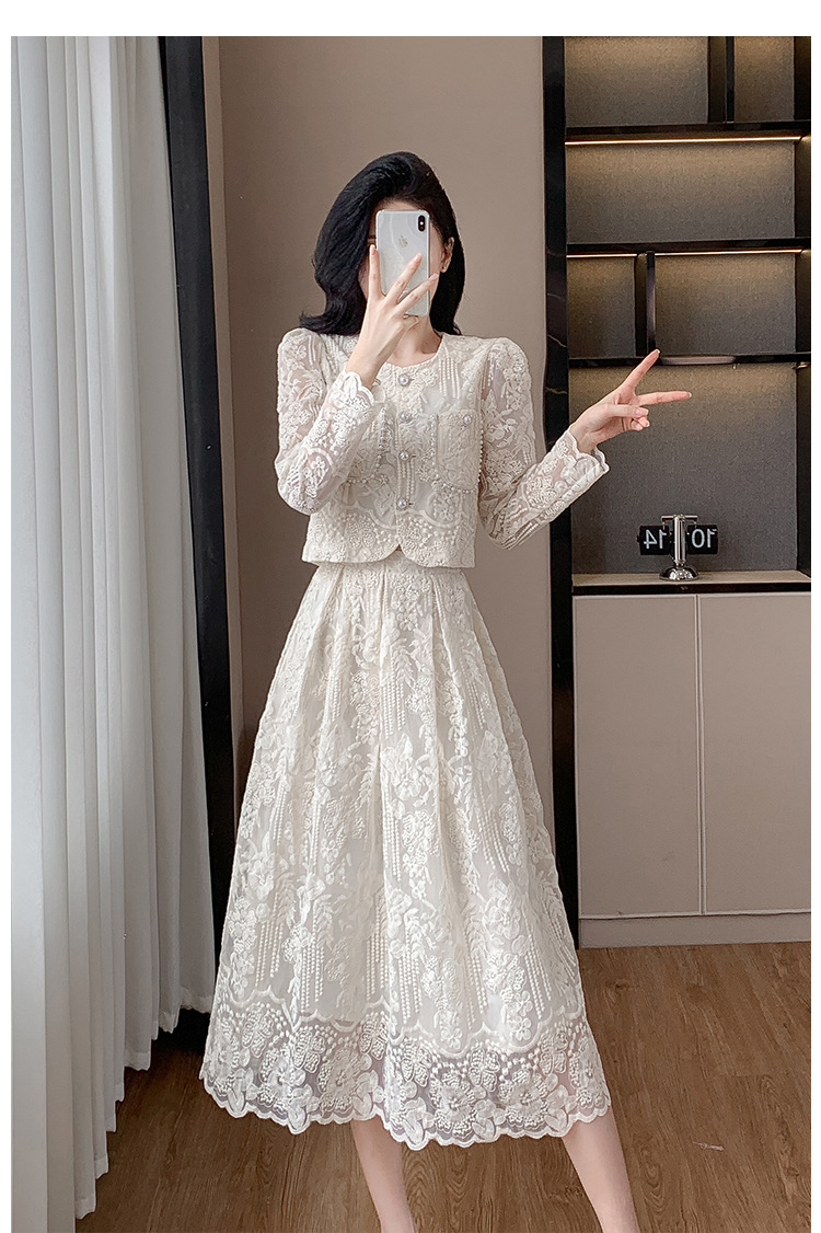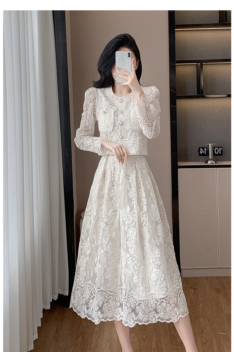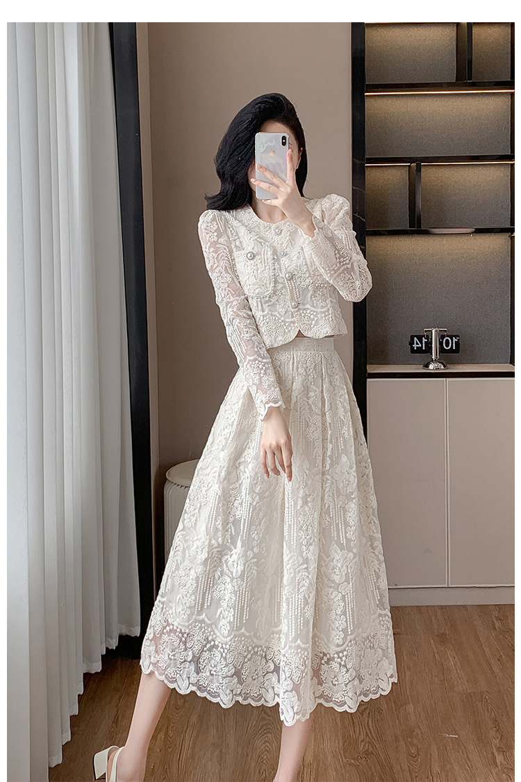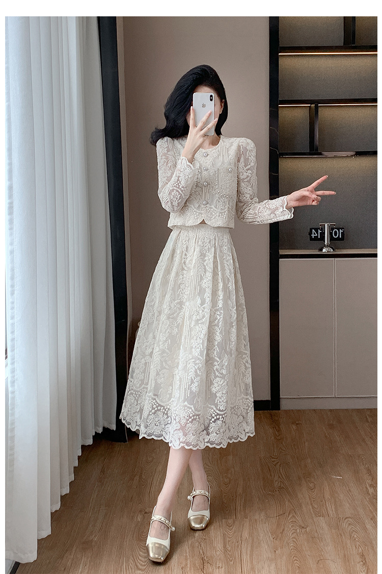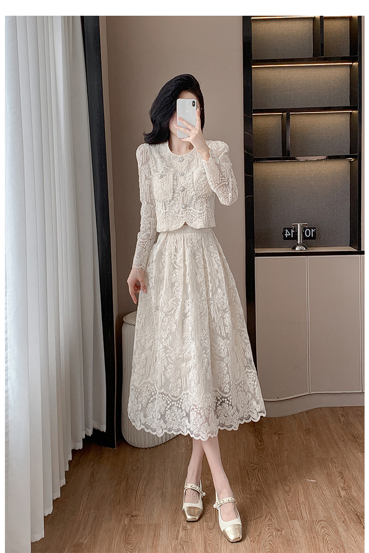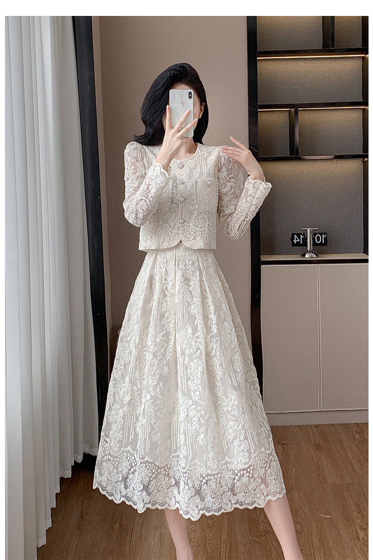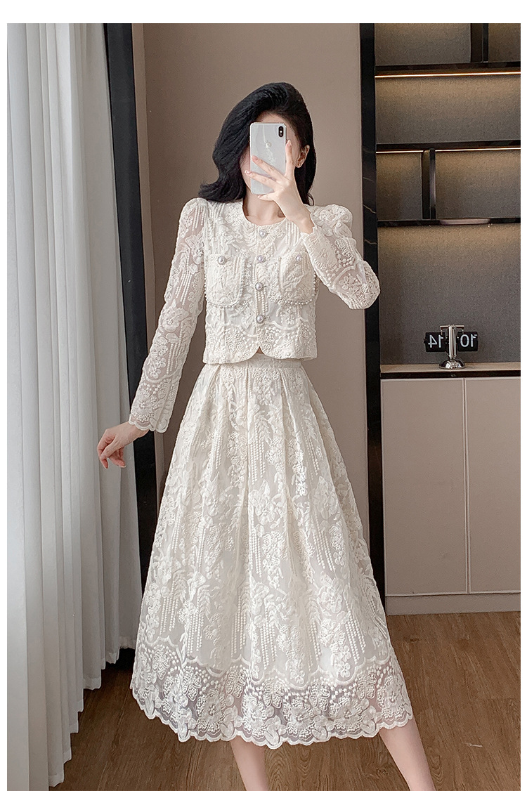 تنورة بدلة مطرزة أنيقة من Socialite Light الفاخرة من الدانتيل القابل للذوبان في الماء، طقم من قطعتين
