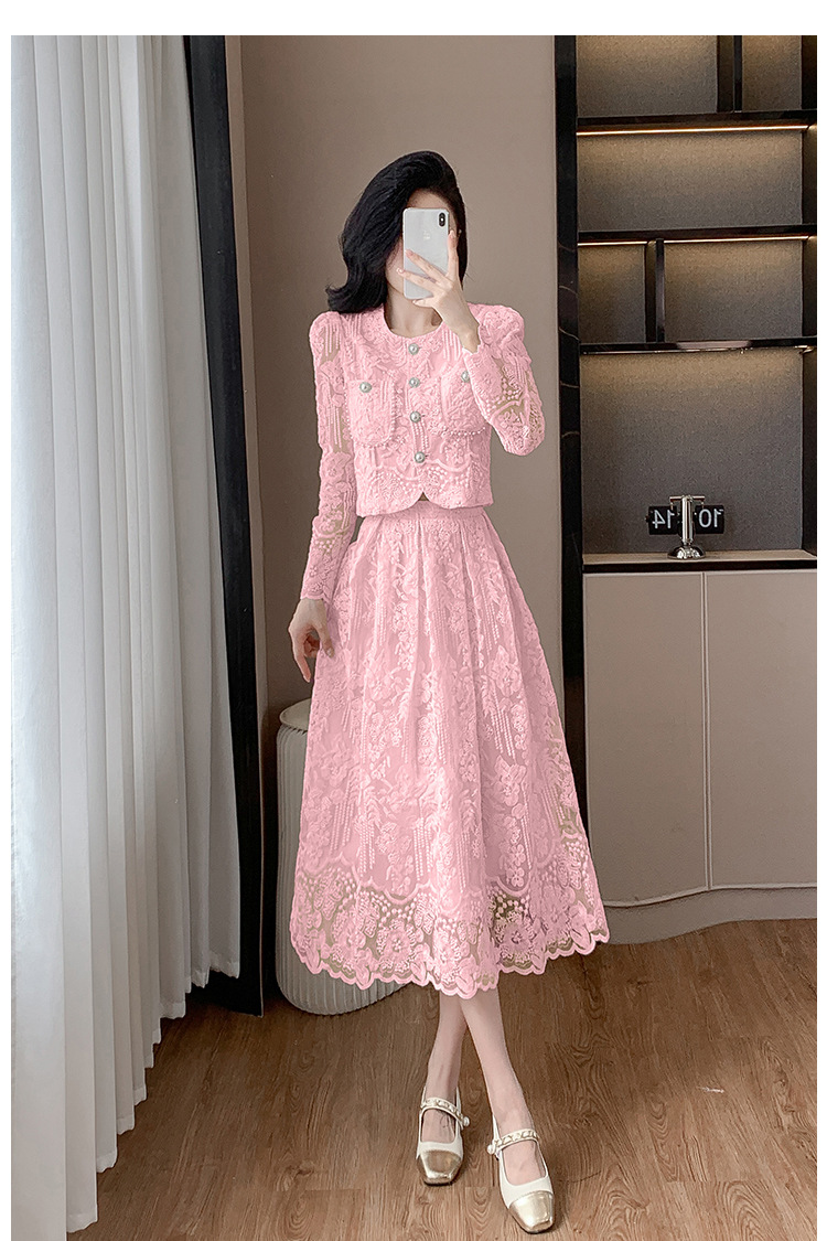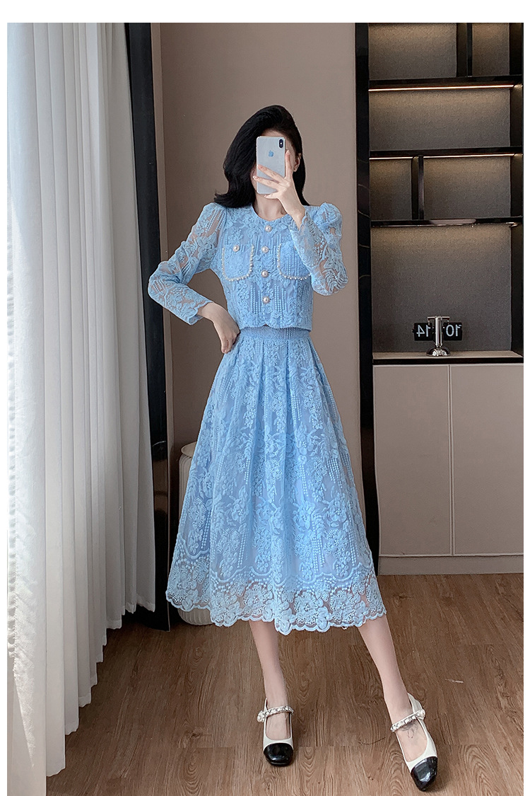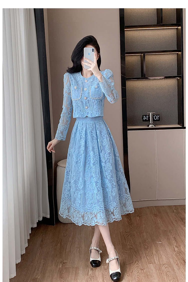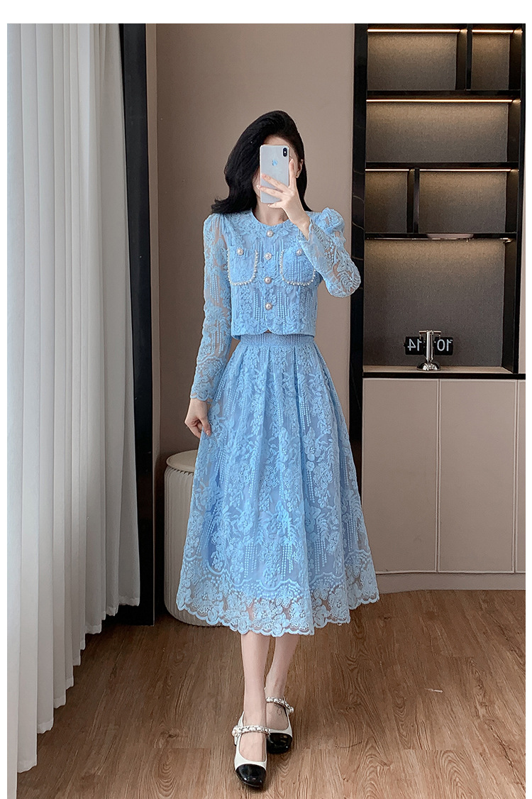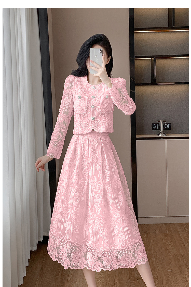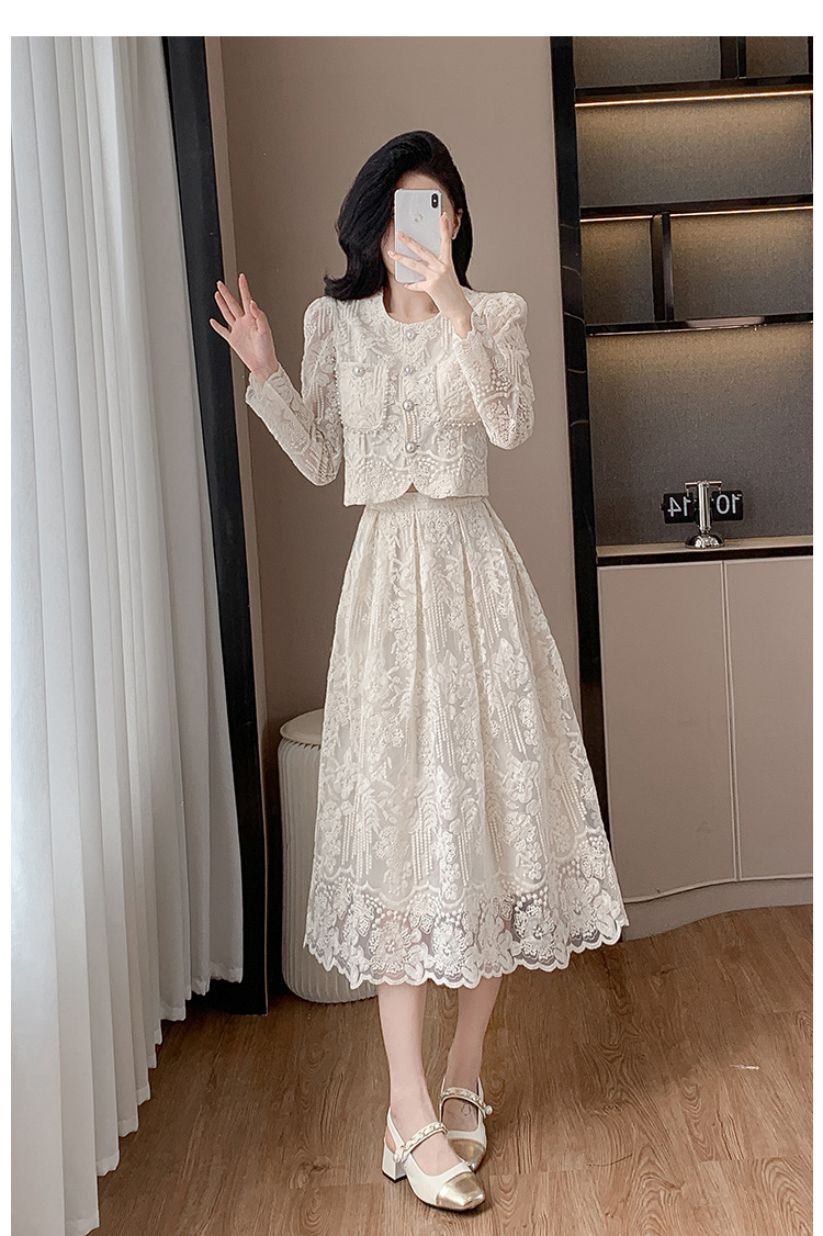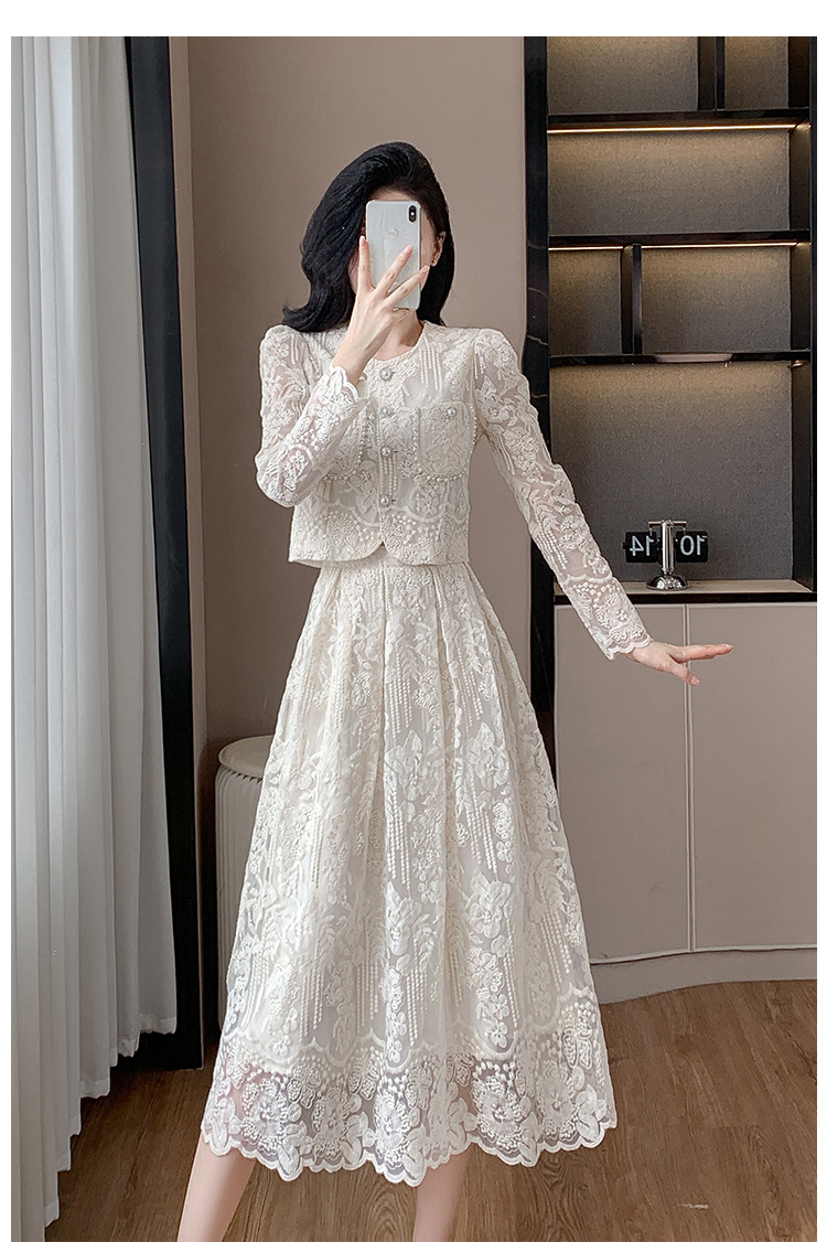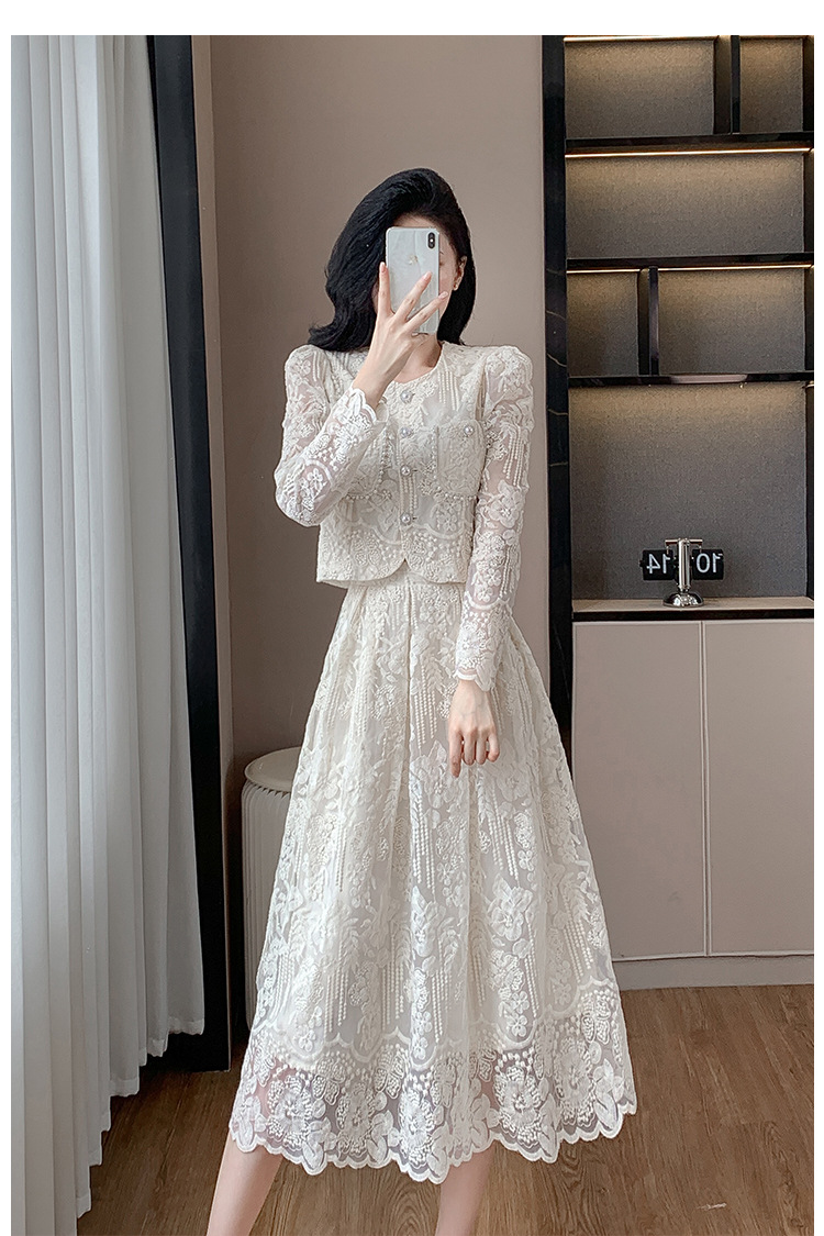 تنورة بدلة مطرزة أنيقة من Socialite Light الفاخرة من الدانتيل القابل للذوبان في الماء، طقم من قطعتين