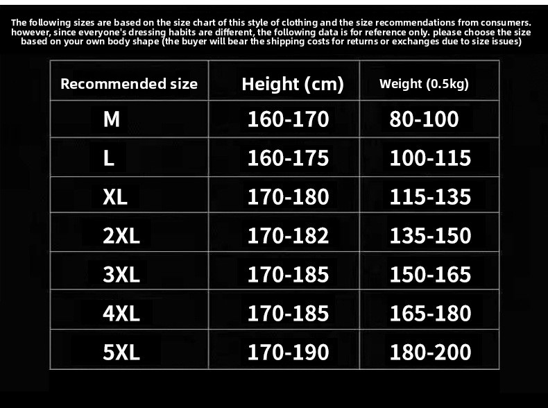 Size Range: M (40-50kg) to 5XL (90-100kg).