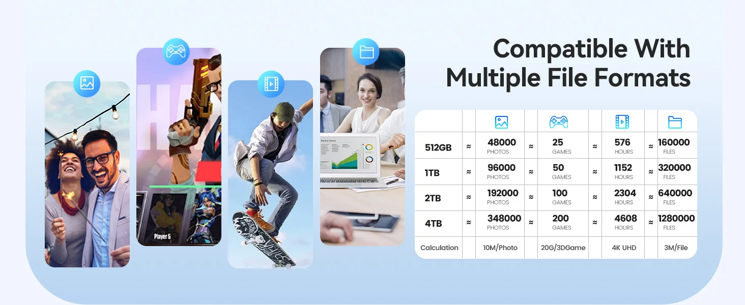 The ORICO B5 PLUS offers various high-capacity storage options, allowing you to choose from 128GB, 256GB, 512GB, 1TB, 2TB, or 4TB. Enjoy the convenience and efficiency of high speed and ample storage space, making your data management effortless and worry-free.