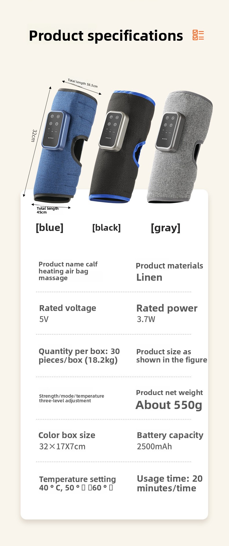 • Air Wave Massage: Utilizes air pressure technology for effective calf muscle relief.