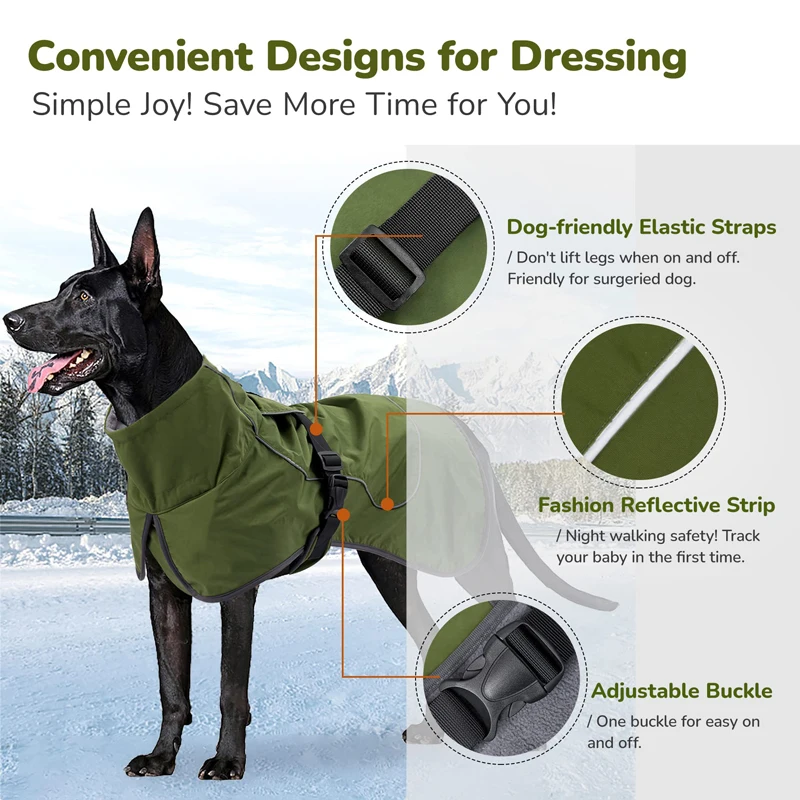 • One Buckle for Easy On and Off: The black strap on the dog's back can adjust the size of the jacket's lining, and one buckle for easy on and off. The two elastic straps on the hind legs have two buckles, and your dog doesn't have to lift its legs when putting on or taking off. Better for dogs with frozen legs due to the cold weather.